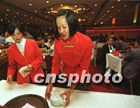 圖:為西部論壇客商服務(wù)小姐行唐代禮節(jié) 2001年09月05日 18:36 ![]() 西安唐樂宮的服務(wù)員五日以唐代禮節(jié)為參加西部論壇的賓客準(zhǔn)備茶水,會(huì)上近二百家國內(nèi)外企業(yè)的代表在此進(jìn)行了項(xiàng)目洽談。中新社記者 宋吉河 攝