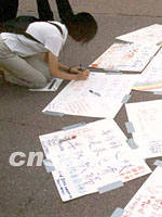 圖:紐約華人以各種形式譴責(zé)恐怖主義 2001年09月19日 15:01 ![]() 紐約華埠孔子廣場(chǎng)平整的紅色地面上,近日貼著許多白色卡紙,上面用中英文寫著譴責(zé)恐怖活動(dòng);悼念“九一一”死難者;祈求世界和平;以及支持重建世貿(mào)中心大廈的字句和詩篇。圖為一位華裔女青年跪在地上寫下自己的心愿。中新社圖 龔文謨 攝 |