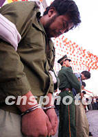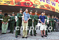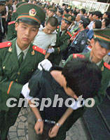 組圖:北京西城警方開展“嚴(yán)打”專項(xiàng)行動 2001年09月20日 15:06 ![]() 袁存敏等七名盜竊、搶劫犯罪嫌疑人,二十日在北京萬通商場前,被西城公安局公開逮捕。警方在人員密集地段進(jìn)行公開宣判,以威懾犯罪分子、增強(qiáng)市民防范意識。中新社記者 宋吉河 攝 ![]() 北京公安西城分局二十日公開逮捕七名犯罪嫌疑人,并對三名違法人員依法勞動教養(yǎng)。該局在“嚴(yán)打”行動中破獲各類刑事案件1531起、抓獲各類犯罪嫌疑人2058名、收容“三無”人員15110人次。中新社記者 宋吉河 攝