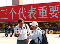 圖:北京天安門廣場掛起“三個代表” 2001年09月22日 10:56 ![]() 十·一前夕,外國游客在北京天安門廣場游覽。在他們身后是為慶祝中國建國五十二周年而掛起的“認真學(xué)習(xí)全面貫徹三個代表重要思想”的橫幅。中新社圖 張宇 攝