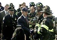 圖:布什訪問紐約 慰問消防隊員 2001年10月04日 11:07 ![]() 美國總統(tǒng)布什三日清晨來到紐約。他一下飛機,就頭戴印有“紐約市消防局”字樣的棒球帽,和參加救援與清理工作的人們握手。“九一一”恐怖襲擊案三周來,布什現(xiàn)已兩次訪問紐約。 |