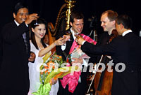 圖文:周潤(rùn)發(fā)說,回歸后澳門變化很大 2001年10月05日 09:45 ![]() 由奧斯卡金像獎(jiǎng)獲得者譚盾(右一)指揮、由多名國(guó)際音樂家和上海交響樂團(tuán)演出的"臥虎藏龍"音樂會(huì),4日晚在"第十五屆澳門國(guó)際音樂節(jié)"演出成功后,周潤(rùn)發(fā)向音樂家表示祝賀。中新社圖 任晨鳴 攝 ![]() 香港巨星周潤(rùn)發(fā)4日到澳門出席"第十五屆澳門國(guó)際音樂節(jié)"中的"臥虎藏龍"音樂會(huì)后,澳門特區(qū)政府社會(huì)文化司司長(zhǎng)崔世安向周潤(rùn)發(fā)頒發(fā)紀(jì)念品。中新社圖 任晨鳴 攝