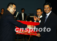 組圖:周潤發(fā)出席澳門國際音樂節(jié) 2001年10月05日 18:57 ![]() 由奧斯卡金像獎獲得者譚盾(右一)指揮、由多名國際音樂家和上海交響樂團演出的"臥虎藏龍"音樂會,4日晚在"第十五屆澳門國際音樂節(jié)"演出成功后,周潤發(fā)向音樂家表示祝賀。中新社圖 任晨鳴 攝 ![]() 香港巨星周潤發(fā)4日到澳門出席"第十五屆澳門國際音樂節(jié)"中的"臥虎藏龍"音樂會后,澳門特區(qū)政府社會文化司司長崔世安向周潤發(fā)頒發(fā)紀念品。中新社圖 任晨鳴 攝