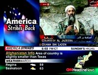 圖:美國(guó)電視節(jié)目中的本·拉登 2001年10月08日 10:57 ![]() 美軍協(xié)同英軍開始對(duì)阿富汗境內(nèi)恐怖組織訓(xùn)練營(yíng)以及塔利班政權(quán)的軍事設(shè)施展開軍事打擊。其后不久,卡塔爾一家電視臺(tái)首先播放了本·拉登講話的錄像。拉登說(shuō):“我對(duì)真主起誓,除非巴勒斯坦人民能夠享受到和平,否則美國(guó)人將永遠(yuǎn)不知和平為何物!泵绹(guó)有線電視網(wǎng)(CNN)在其黃金時(shí)間的節(jié)目中,反復(fù)播放拉登的錄相,提醒人們警惕新的恐怖報(bào)復(fù)行動(dòng)。 |