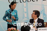 組圖:APEC貿(mào)投會執(zhí)行主席召開新聞發(fā)布會 2001年10月17日 15:29 ![]() APEC貿(mào)易投資委員會執(zhí)行主席GERMAN KING(左),十七日在上海國際新聞中心召開新聞發(fā)布會,他在回答中外記者提問時(shí)說,貿(mào)易和投資自由化的推動將有利于減弱恐怖活動對世界經(jīng)濟(jì)的不良影響。中新社記者 王瑤 攝 ![]() 身著旗袍的上海小姐為APEC會議服務(wù),在十七日召開的新聞發(fā)布會上,APEC貿(mào)易投資委員會執(zhí)行主席GERMAN KING向服務(wù)小姐點(diǎn)頭致謝。中新社記者 王瑤 攝