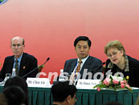 圖:e-APEC工作組在滬舉行新聞發(fā)布會(huì) 2001年10月19日 13:49 ![]() e-APEC工作組十九日在上海舉行新聞發(fā)布會(huì),介紹數(shù)字APEC戰(zhàn)略。圖為工作組主席、來(lái)自中國(guó)信息產(chǎn)業(yè)部的陳因(中)、工作組副主席美國(guó)APEC官員拉里·格林伍德先生(左)和澳大利亞官員帕梅拉·費(fèi)伊利女士(右)在新聞發(fā)布會(huì)上。中新社記者 潘索菲 攝 |