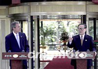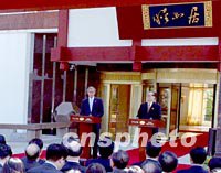 ![]() 十月十九日,美國總統(tǒng)布什在上海西郊賓館“睦如居”與中國國家主席江澤民會談,并共同在此舉行記者招待會!澳馈睘楹湍,“如”為如意。以此命名的江南風格賓館,是外國元首下榻之地。中新社記者 賈國榮 攝