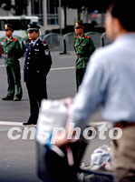 APEC花絮:天公作美 市民配合(附圖) 2001年10月20日 20:51 ![]() 出席APEC會(huì)議的各國(guó)首腦20日齊聚上海,浦東陸家嘴實(shí)行交通管制,一個(gè)騎車出行的市民從街頭整齊列隊(duì)站立的警員身邊經(jīng)過,上海安全保衛(wèi)處于前所未有的一級(jí)警備狀態(tài)。中新社記者 王瑤 攝 ![]() 二十日上海APEC主會(huì)場(chǎng)區(qū)域地帶——浦東陸家嘴金融貿(mào)易區(qū)全面戒嚴(yán)。圖為正在執(zhí)行任務(wù)的武警。中新社記者 潘索菲 攝