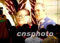 組圖:布什穿中式服裝亮相APEC峰會 2001年10月21日 11:31 ![]() 美國總統(tǒng)布什身穿藍(lán)色中式對襟服裝走出特制專用轎車,出席二十一日的上海APEC峰會。中外記者聚集在現(xiàn)場直播的電視屏幕前,進行同步報道。中新社記者 賈國榮 攝 ![]() 十月二十一日清晨,中外記者聚集在上海國際新聞中心現(xiàn)場直播的電視屏幕前,關(guān)注中國國家主席江澤民身著紅色中式對襟服,迎接身穿藍(lán)色中式對襟服的美國總統(tǒng)布什,進行出席上海APEC峰會。中新社記者 賈國榮 攝