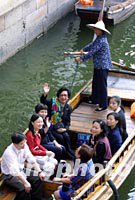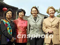 組圖:APEC首腦配偶暢游“中國第一水鄉(xiāng)” 2001年10月21日 14:37 ![]() 香港特別行政區(qū)長官董建華的夫人趙洪娉十月二十一日與參加上海APEC領導人峰會的首腦夫人一起在水鄉(xiāng)周莊游船,圖為她向岸邊的市民招手。中新社記者 潘索菲 攝 ![]() APEC首腦夫人21日暢游“中國第一水鄉(xiāng)”。香港特首夫人趙洪娉(左)、加拿大克雷蒂安總理夫人艾琳·克雷蒂安(右二)、澳大利亞霍華德總理夫人珍妮特·霍華德(右)與陪同游玩的江蘇省副省長張連珍在周莊一起合影。中新社記者 潘索菲 攝