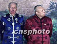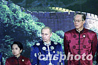 ![]() 美國總統(tǒng)布什身穿唐裝二十一日站在上?萍拣^中國萬里長城圖案背景前,聆聽中國國家主席江澤民宣讀APEC《領(lǐng)導(dǎo)人宣言》。亞太經(jīng)合組織第九次領(lǐng)導(dǎo)人非正式會議二十一日在上海圓滿閉幕。中新社記者 王瑤 攝 ![]() 新加坡總理吳作棟、泰國總理他信、美國總統(tǒng)布什和越南總理潘文凱身穿唐裝21日站在上?萍拣^中國萬里長城圖案背景前,聆聽中國國家主席江澤民宣讀APEC《領(lǐng)導(dǎo)人宣言》。亞太經(jīng)合組織第九次領(lǐng)導(dǎo)人非正式會議21日在上海圓滿閉幕。中新社記者 王瑤 攝