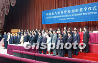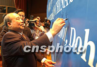 中新社記者卡塔爾特寫:今宵多歡樂(附圖) 2001年11月12日 02:42 ![]() 中國(guó)加入WTO簽字儀式于北京時(shí)間12日凌晨在多哈舉行,圖為簽字現(xiàn)場(chǎng)。中新社記者 錢興強(qiáng) 攝 ![]() 石廣生部長(zhǎng)于北京時(shí)間12日在多哈簽署中國(guó)入世議定書后,在會(huì)場(chǎng)橫幅上簽名留念,記錄下這一歷史時(shí)刻。中新社記者 錢興強(qiáng) 攝