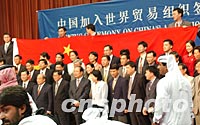![]() 北京時(shí)間12日中國(guó)代表團(tuán)成員在多哈展示中國(guó)國(guó)旗,慶祝中國(guó)入世。中新社記者 錢興強(qiáng) 攝
