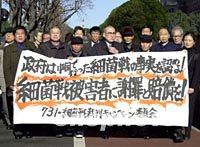圖:侵華日軍細(xì)菌戰(zhàn)案結(jié)束法庭調(diào)查舉證 2001年12月26日 18:38 ![]() 一百八十名中國受害者起訴侵華日軍七三一部隊實施細(xì)菌戰(zhàn)罪行的訴訟歷時四年之久,26日結(jié)束了法庭調(diào)查舉證階段,明年春將予判決。圖為中國原告代表與日本代理律師在26日開庭前,在東京地方法院前宣示決心。中新社記者 陶光雄 攝 |
