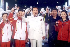 圖:歌星、體育明星春節(jié)晚會舉杯同慶 2002年02月07日 20:32 ![]() 歌星、體育明星在央視春節(jié)晚會節(jié)目中演唱《舉杯吧、朋友》,以此慶賀中國申奧成功、足球沖入世界杯連連喜事。中新社圖