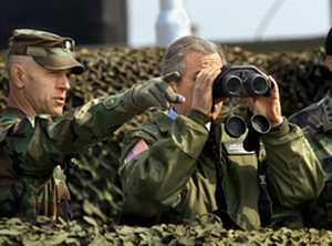 布什視察都羅山車(chē)站 稱(chēng)南北鐵路是和平之路(圖) 2002年02月20日 14:41 ![]() 布什在非軍事區(qū)用望遠(yuǎn)鏡觀望朝鮮一側(cè)(美聯(lián)社) 中新網(wǎng)北京2月20日消息:韓國(guó)總統(tǒng)金大中和來(lái)訪(fǎng)的美國(guó)總統(tǒng)布什今天視察都羅山車(chē)站。這個(gè)車(chē)站是金大中希望連接平壤和漢城的鐵路線(xiàn)的北終點(diǎn)站。 據(jù)韓國(guó)聯(lián)合新聞社報(bào)道,金大中希望借此舉來(lái)敦促朝鮮對(duì)恢復(fù)對(duì)話(huà)的呼吁作出回應(yīng)。 在上午的首腦會(huì)談中,兩國(guó)總統(tǒng)就聽(tīng)取了這項(xiàng)連接南北的鐵路工程的進(jìn)度情況簡(jiǎn)報(bào)。 在舉行聯(lián)合記者招待會(huì)后,布什乘直升飛機(jī)花費(fèi)二十分鐘抵達(dá)非軍事區(qū)。這個(gè)二點(diǎn)五英里寬,一百五十一英里長(zhǎng)的區(qū)域布滿(mǎn)地雷,分界線(xiàn)兩側(cè)駐扎著將近朝韓兩百萬(wàn)軍隊(duì)。 美國(guó)在韓國(guó)保持有三萬(wàn)七千人的駐軍。布什在抵達(dá)時(shí)向一名指揮官威廉·米勒中校敬禮致意。 布什在都羅山車(chē)站發(fā)表講話(huà)。他說(shuō):“我們今天相聚在這里,周?chē)浅r半島和平與穩(wěn)定受到挑戰(zhàn)時(shí)的遺跡。金大中總統(tǒng)剛才向我介紹了一條他修建的道路--一條和平之路。” 據(jù)路透社報(bào)道,布什敦促朝鮮對(duì)韓國(guó)開(kāi)放邊境。他說(shuō):“這條鐵路可能將這塊分裂的土地兩側(cè)的人民帶到一起來(lái)。為了朝鮮半島全體人民的福祉,朝鮮應(yīng)該完成它。” 布什在非軍事區(qū)的講話(huà)強(qiáng)硬的措詞中也顯示出靈活性。他甚至在談及朝鮮時(shí)仍使用了“邪惡”這個(gè)字眼,但他同時(shí)也重申了朝鮮對(duì)話(huà)的建議。 在一個(gè)觀察哨所里,布什身穿一件手臂上繡有美國(guó)國(guó)旗的綠色軍用夾克,通過(guò)雙筒望遠(yuǎn)鏡從壘著沙袋的地堡內(nèi)觀察朝鮮一側(cè)。