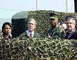 布什近距離"觀察"朝鮮 地堡豎起防彈玻璃(圖) 2002年02月20日 16:04 ![]() 布什所在的地堡內(nèi)豎起了防彈玻璃 中新網(wǎng)北京2月20日消息:韓國(guó)總統(tǒng)金大中和來(lái)訪的美國(guó)總統(tǒng)布什今天視察都羅山車站。 在一個(gè)觀察哨所里,布什身穿一件手臂上繡有美國(guó)國(guó)旗的綠色軍用夾克,通過(guò)雙筒望遠(yuǎn)鏡從壘著沙袋的地堡內(nèi)觀察朝鮮一側(cè)。 路透社的報(bào)道說(shuō),在專門為他視察設(shè)置的防彈玻璃后面,布什望見(jiàn)了一座朝鮮的紀(jì)念館。 安全人員在一側(cè)豎起這塊防彈玻璃,保護(hù)在地堡內(nèi)的布什。他所在的位置距離非軍事區(qū)分離南北兩側(cè)的中央線只有一百米。 從布什的位置望去,朝鮮一側(cè)的哨所都清晰可見(jiàn)。在地堡上面停留十分鐘后,布什和國(guó)務(wù)卿鮑威爾與美國(guó)士兵共進(jìn)午餐。 他們與約二十名美軍士兵一起品嘗了冷盤、炸土豆片、水果和餅干。這些士兵二十小時(shí)都在這個(gè)哨所值勤。 在被問(wèn)及他觀望朝鮮一側(cè)的感受時(shí),布什回答說(shuō):“我們已經(jīng)準(zhǔn)備好了!