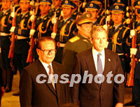 圖:江主席歡迎布什訪華 2002年02月21日 13:01 ![]() 中國國家主席江澤民二十一日在北京人民大會堂舉行儀式,與訪華的美國總統(tǒng)布什檢閱解放軍三軍儀仗隊。中新社圖 賈國榮 攝