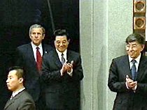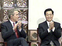 圖:胡錦濤陪同布什總統(tǒng)進入清華會場 2002年02月22日 10:55 ![]() ![]()