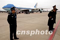 圖文:中國(guó)軍警在機(jī)場(chǎng)嚴(yán)密保衛(wèi)美“空軍一號(hào)” 2002年02月22日 18:45 ![]() 中國(guó)軍警二十二日在北京機(jī)場(chǎng)嚴(yán)密保衛(wèi)美國(guó)總統(tǒng)布什乘坐的空軍一號(hào)專機(jī)。中新社記者 賈國(guó)榮 攝