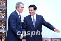 圖:國家副主席胡錦濤與美國總統(tǒng)布什握手告別 2002年02月22日 19:52 ![]() 中國國家副主席胡錦濤二十二日在北京清華大學與美國總統(tǒng)布什握手告別。中新社記者 賈國榮 攝