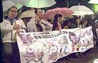 組圖:日本民眾冒雨集會游行反對“有事法制” 2002年03月23日 11:10 ![]() 圖(1) ![]() 圖(2) ![]() 圖(3) 說明(1)來自勞動、教育、醫(yī)療、宗教等民間團(tuán)體的三千五百多名日本民眾,22日晚在東京市內(nèi)一個公園里冒雨集會,反對政府制定“有事法制”。 說明(2)日本多個民間團(tuán)體22日晚在東京市內(nèi)一個公園里冒雨集會,反對政府制定“有事法制”。圖為市民們用漫畫歷數(shù)“有事法制”的種種危害。 說明(3)三千五百多名日本民眾22日晚在東京市內(nèi)一個公園里冒雨集會并游行,反對政府制定“有事法制”。圖為日本共產(chǎn)黨的國會議員聲援游行隊(duì)伍,并接受他們的請?jiān)。中新社圖 陶光雄 攝 相關(guān)報(bào)道: 相關(guān)報(bào)道:森喜朗決定設(shè)立所謂“有事法制”