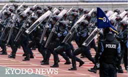如何應(yīng)對(duì)球迷狂熱情緒?日本推出三大"必殺計(jì)" 2002年04月12日 16:20 ![]() 在舉行世界杯決賽的體育場(chǎng)進(jìn)行的大規(guī)模演練中手持透明盾牌的機(jī)動(dòng)隊(duì)員(“共同社”10日下午攝于橫濱市港北區(qū)的橫濱國(guó)際綜合競(jìng)技場(chǎng))