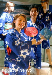 圖文:印有足球圖案的日本浴衣美女裝閃亮登場(chǎng) 2002年04月24日 09:33 ![]() 在世界杯之前發(fā)售的有足球圖案的浴衣(最前者所穿)=18日下午于東京·東武百貨店池袋分店(共同社)