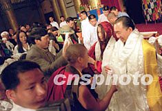 臺(tái)灣前政要陳履安長(zhǎng)子與藏族姑娘在京喜結(jié)良緣 2002年04月28日 17:09 ![]() 圖為藏族姑娘在父親的帶領(lǐng)下步入結(jié)婚禮堂。王麗南 攝 ![]() 臺(tái)灣先生與西藏女認(rèn)識(shí)兩月成婚。王麗南 攝 ![]() 參加陳宇廷和藏族姑娘央金拉姆的婚禮,爭(zhēng)相為新婚人送哈達(dá)。王麗南 攝 中新社北京四月二十八日電(記者耿軍)臺(tái)灣知名人士陳履安先生的長(zhǎng)子陳宇廷與西藏女企業(yè)家、歌手央金拉姆喜結(jié)良緣。陳宇廷與央金拉姆的婚禮今天上午在北京飯店大宴會(huì)廳舉行。 婚禮主禮臺(tái)正后方懸掛著碩大的“解脫”二字,左右懸掛弘一大師的書法“不為自己求安樂,但愿眾生得離苦”。主禮臺(tái)上陳放有四只高大的經(jīng)幢及唐卡,六位身披法衣的喇嘛分列兩側(cè)。 上午十一時(shí),婚禮在法號(hào)聲中開始。大型投影屏幕上播放新人剪影短片,片中介紹了陳宇廷的爺爺陳誠(chéng)、父親陳履安及央金拉姆一家。 當(dāng)身著白色中式對(duì)襟衫的伴郎陪陳宇廷、身著藏裝的伴娘陪央金拉姆入席時(shí),活佛帶領(lǐng)喇嘛唱頌吉祥祝福文。 這對(duì)新人依次獻(xiàn)上禮品,以報(bào)答父母、眾生、國(guó)家和三寶四重恩德,并跟隨活佛念“懺悔經(jīng)”、“發(fā)愿文”。 這對(duì)新人在宣讀結(jié)婚誓約后,交換信物。陳宇廷贈(zèng)予央金漢傳僧服和藏傳僧服,央金贈(zèng)予陳宇廷金鋼鈴和金鋼杵。 陳履安先生代表家長(zhǎng)向主持婚禮的活佛及來賓表示感謝。 擔(dān)任解脫服飾實(shí)業(yè)副董事長(zhǎng)、化育文教基金會(huì)與陳誠(chéng)文教基金會(huì)執(zhí)行長(zhǎng)的陳宇廷,今年三十七歲,曾獲哈佛大學(xué)企業(yè)管理碩士學(xué)位。央金拉姆是藏族女企業(yè)家和歌手,她曾在北京中央民族大學(xué)藝術(shù)系和蘭州西北民族大學(xué)藝術(shù)系就讀,近年出任奇正藏藥集團(tuán)營(yíng)銷副總經(jīng)理。這對(duì)新人于去年在廣東中山相識(shí)。 各界人士近千人出席了今天的婚禮。 相關(guān)報(bào)道:臺(tái)灣前“監(jiān)察院長(zhǎng)”陳履安抵京參加兒子婚禮