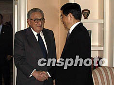 圖:胡錦濤副主席會見美國前國務(wù)卿基辛格 2002年04月30日 13:59 ![]() 中國國家副主席胡錦濤二十九日下午在下榻的華爾道夫酒店會見了美國前國務(wù)卿基辛格。中新社記者 趙海燕 攝