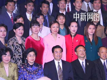 美國當(dāng)?shù)貢r間四月三十日晚,正在華盛頓訪問的胡錦濤副主席在他下榻的飯店接見華人華僑、留學(xué)生代表、中國駐美使館工作人員和中資機(jī)構(gòu)的代表。圖為胡副主席與華盛頓地區(qū)的旅美學(xué)人合影。中新社 徐德金/攝