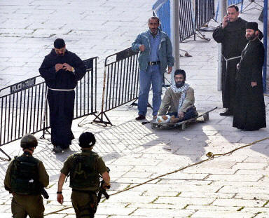 詳訊:39名巴勒斯坦武裝人員今天離開圣誕教堂 2002年05月10日 14:10 圖為受腿傷的武裝人員。法新圖 中新網(wǎng)北京5月10日消息:伯利恒當(dāng)?shù)貢r間5月10日上午(北京時間5月10日中午),被困伯利恒圣誕教堂長達(dá)五周之久的39名巴勒斯坦武裝人員今天被幾輛公共汽車帶走。根據(jù)歐盟調(diào)解的協(xié)議,其中13名以色列方面強(qiáng)烈通緝的武裝人員將被一架英國軍用飛機(jī)帶往塞浦路斯,然后轉(zhuǎn)往幾個歐洲國家。另外26名武裝人員將被帶往加沙地區(qū)。 據(jù)以色列軍方的一位發(fā)言人稱,載有13名巴方武裝人員的公共汽車已經(jīng)抵達(dá)教堂附近的一個軍事基地,其中一名武裝人員將在那里接受腿傷治療,然后他們將被帶往特拉維夫附近的一個機(jī)場。 另據(jù)報道,英國一架軍用飛機(jī)已經(jīng)離開塞浦路斯基地,前往以色列引渡13名巴勒斯坦武裝人員,這些武裝人員曾在伯利恒的圣殿教堂與以色列軍方對峙交火。 這架軍用飛機(jī)的型號是綽號“大力神”的C-130型運輸機(jī),塞浦路斯官員表示,“有關(guān)方面通知我們這架飛機(jī)是前往以色列引渡巴勒斯坦人員的! 塞浦路斯曾于本周四與歐盟官員進(jìn)行過協(xié)商,并決定暫時收容這13名巴方武裝人員。官員們預(yù)計這些武裝人員將在塞浦路斯停留至下周一,然后由歐盟外長會議決定他們應(yīng)當(dāng)被引渡到何地。被引渡的13名武裝人員中包括伯利恒的巴勒斯坦情報部門的首腦阿卜杜拉-道德(Abdullah Daoud)。 根據(jù)以巴雙方達(dá)成的和解協(xié)議,在這13名巴方的武裝人員被引渡到歐盟國家以后,另外26名巴方人員將被帶到加沙地區(qū),以方還將釋放大約85名平民。(春風(fēng))
