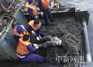 圖:第七十五具空難遇難者遺體被打撈出水 2002年05月11日 22:13 ![]() 北海艦隊某部救撈船官兵5月11日傍晚時分又打撈出一具男性遇難者遺體,至此,“五·七”空難遇難者遺體已有七十五具被打撈出水。(中新社記者:王麗南攝)