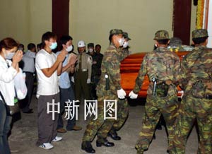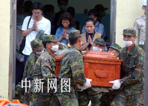 組圖:馬公空軍基地成華航遇難者身份辨認(rèn)中心 2002年05月26日 22:56 ![]() 部分失事華航客機(jī)遇難乘客遺體從澎湖空運(yùn)回臺(tái)灣島。5月26日傍晚,部分已經(jīng)確認(rèn)身份的失事華航客機(jī)遇難乘客尸體被巨型C130運(yùn)輸機(jī)運(yùn)回臺(tái)灣島。中新社傳真任晨鳴攝 ![]() 多數(shù)華航遇難乘客家屬選擇土葬。5月26日,臺(tái)灣澎湖馬公空軍基地成為搜索到的遇難乘客尸體辨認(rèn)中心。中新社傳真任晨鳴攝 ![]() 擺放在臺(tái)灣澎湖馬公空軍基地中的盛殮遇難者遺體的棺材。5月26日,臺(tái)灣澎湖馬公空軍基地中的遇難乘客尸體辨認(rèn)中心排列了眾多棺材。中新社傳真任晨鳴攝 ![]() 華航遇難乘客家屬送親人上靈車。5月26日下午,確認(rèn)了身份的華航遇難乘客尸體被家屬送上靈車。中新社傳真任晨鳴攝 ![]() 臺(tái)灣澎湖馬公空軍基地成為華航遇難乘客身份辨認(rèn)中心。一向門禁森嚴(yán)的臺(tái)灣澎湖馬公空軍基地,5月26日人流不息,成為華航遇難乘客的身份辨認(rèn)中心。中新社傳真任晨鳴攝 鄭重聲明:關(guān)于臺(tái)灣華航飛機(jī)失事的新聞信息,系中新網(wǎng)特稿,未經(jīng)書面授權(quán),不得采用。