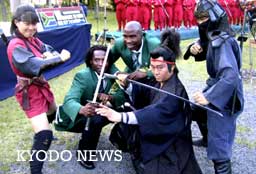 南非隊抵日:日本忍者護衛(wèi) 普通民眾歡迎(圖) 2002年05月29日 09:44 ![]() 從忍者處借刀留影的世界杯南非隊選手=24日下午,三重縣上野市(共同社) 中新網東京5月29日消息:將出戰(zhàn)世界杯的南非國家隊一行約40人24日抵達三重縣上野市的集訓地,在這個“伊賀忍者的故鄉(xiāng)”,他們受到約2000市民的熱烈歡迎。 據“共同社”報道,選手們在身著黑色和紅色忍者服的50名男女志愿者的護衛(wèi)之下,參加了為他們舉行的歡迎儀式。市長今岡睦之鼓勵選手們“我期待你們能和日本隊在決賽中相遇”。 代表團團長REUBEN·MAHLALELA在歡迎儀式上呼吁“我們最終選擇上野市作為集訓地,希望各位在為日本隊加油助威的時候也別忘了為我們南非隊送上一點鼓勵! 隨著種族歧視制度的消除,南非選手實力漸進,他們在歡迎儀式的舞臺上一邊用腳打著拍子一邊引吭高歌非洲民謠,熱鬧的氣氛遍布整個會場。 選手們絲毫看不出長途旅行后的疲憊,對于簽名要求來者不拒,還有選手從忍者那里借來刀和市民們一起留影。扮演忍者的池澤基善(52)很開心的說道“在其他的集訓地,有一些參賽隊選手不和市民交流,相比之下,南非的選手們可開朗熱情多了!