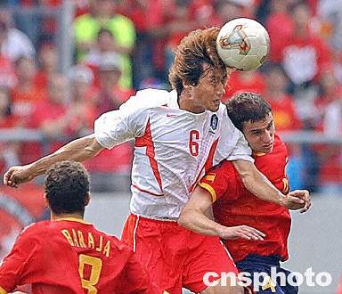 圖:西班牙VS韓國 柳相鐵飛身頂球 2002年06月22日 15:12 ![]() 6月22日韓日世界杯1/4決賽,西班牙隊(duì)VS韓國隊(duì)的比賽在韓國光州體育場進(jìn)行。目前場上比分為0:0。圖為韓國隊(duì)6號(hào)柳相鐵飛身頂球。