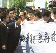 圖文:臺(tái)灣華航空難公祭 罹難者家屬抗議當(dāng)局無能 2002年06月22日 15:58 ![]() 罹難者家屬向阿扁表示抗議 聯(lián)合報(bào)/圖 中新網(wǎng)香港6月22日消息:臺(tái)北訊,臺(tái)灣當(dāng)局今天上午在臺(tái)北市為“五·二五”華航空難罹難者舉行聯(lián)合公祭。眾多罹難者家屬手舉“冤沉大海、還我命來”標(biāo)語,抗議當(dāng)局無能,并要求尋回每一具罹難者遺體。 據(jù)臺(tái)灣媒體報(bào)道,包括陳水扁、呂秀蓮等眾多島內(nèi)政壇人物在內(nèi),這場(chǎng)聯(lián)合公祭約有三千人參加,靈堂內(nèi)布有鮮花及225名罹難者的遺像,以及鐫刻罹難者姓名的石碑。 在靈堂正中央,設(shè)有一座名為“水火熱淚”的意像品。從失事現(xiàn)場(chǎng)取來的海水被注入“水火熱淚”中后,其中的火炬再被點(diǎn)燃,象征罹難者的精神與魂魄永遠(yuǎn)與親人同在。 據(jù)報(bào)道,當(dāng)陳水扁步入會(huì)場(chǎng)時(shí),傷心欲絕的罹難者家屬手舉白布條,一字排開,高喊著“不要敷衍我們、一定要找出真相”,有人邊流淚邊訴說,失蹤20多天的父親至今還不知下落,仍然被壓在海底。陳水扁稱“搜救沒有時(shí)間表”。 另外,不少罹難者家屬認(rèn)為,今天這場(chǎng)公祭只是一場(chǎng)虛情假意的惡心秀場(chǎng)。 罹難者陳杰人的胞兄難過地表示,這個(gè)星期三夜里,他夢(mèng)見了全身濕透的弟弟,在冰冷的海中載浮載沉,痛苦地向他喊著“哥哥,救命、救命”,當(dāng)他驚醒后,就再也無法入眠。 抗議的白布條上寫著“公祭咒我必死、救命救命、等了很久、我要回家、趕快來接我”等字句,陳家無奈地指出,打撈工作進(jìn)度實(shí)在太慢,這對(duì)家屬相當(dāng)不公平,目前還有60多位罹難者仍在深海中沉蕩,今日的聯(lián)合公祭“盛會(huì)”,是否宣告著政府與華航責(zé)任已了? 陳杰人的胞兄說,主事者的無作為,讓打撈工作空轉(zhuǎn)了20多天,直到受難者靈肉支離破碎的時(shí)刻,才找來確實(shí)有能力的新加坡打撈公司,今天公祭意義何在?只不過是一場(chǎng)虛情假意的惡心秀場(chǎng)。 華航一架波音747-200客機(jī)5月25日在臺(tái)灣海峽澎湖上空解體成4大塊,墜入海中,機(jī)上乘客及機(jī)組人員全部罹難。目前已找到了158具尸體,還有67具死難者的遺體還未找到。