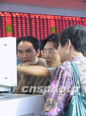 今天股市“牛氣”沖天 個(gè)股全線飄紅大多數(shù)漲停 2002年06月24日 15:29 ![]() 停止國(guó)有股減持的重大利好刺激,使滬深股市個(gè)股二十四日全線暴漲。中國(guó)股市的走勢(shì)目前受政策影響比較大,為明顯的“政策市”。圖為北京湘財(cái)證券營(yíng)業(yè)廳內(nèi)的股民在研判股票走勢(shì)。作者:章永哲
