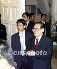 ![]() 六月三十日,香港特首董建華在香港特區(qū)政府禮賓府歡迎國家主席江澤民。潘索菲 攝