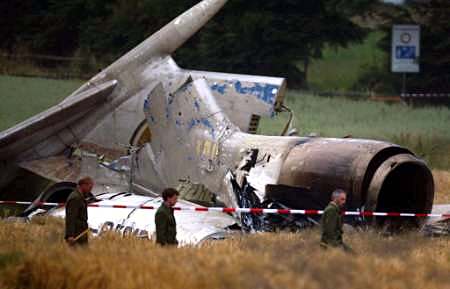 圖:一位德國(guó)警察在墜毀的圖-154客機(jī)附近搜尋 2002年07月02日 14:50 ![]() 德國(guó)當(dāng)?shù)貢r(shí)間7月1日夜(北京時(shí)間2日晨),一架DHL公司的波音757貨機(jī)和俄羅斯圖-154客機(jī)在德國(guó)巴登-符騰堡州于伯林根鎮(zhèn)上空相撞并墜毀,至少已造成71人死亡。圖為一位德國(guó)警察在墜毀的圖-154客機(jī)附近搜尋。(春風(fēng))