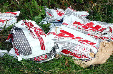 圖文:DHL公司的郵袋散落在地 2002年07月03日 14:36 德國(guó)當(dāng)?shù)貢r(shí)間7月1日夜(北京時(shí)間2日晨),一架DHL公司的波音757貨機(jī)和俄羅斯巴什基爾航空公司的圖-154客機(jī)在德國(guó)巴登-符騰堡州于伯林根鎮(zhèn)上空相撞并墜毀,至少已造成71人死亡,其中包括52名兒童。圖為DHL公司的郵袋散落在地。(春風(fēng))