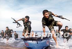 圖:解放軍沖鋒舟武裝搶灘登陸演習 2002年08月03日 17:28 ![]() 沈陽軍區(qū)官兵今夏在東北某海域進行水上多項軍事課目訓練,演習武裝搶灘登陸,向既定目標快速挺進。作者:馬檣