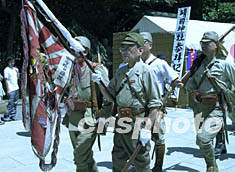 ![]() 十五日是日本戰(zhàn)敗五十七周年紀(jì)念日,在供奉有二戰(zhàn)戰(zhàn)犯的的靖國神社前,一群穿著原“鬼子兵”軍服的人趾高氣揚(yáng)地來回游走。陶光雄 攝