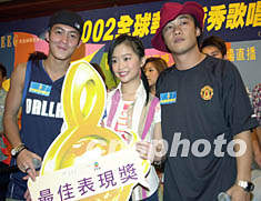 歌星陳奕迅、陳冠希8月15日在香港出席「2002全球華人新秀歌唱大賽(香港區(qū)選拔賽)」記者會,八位新秀會上為18日晚進行大賽作最后熱身,以勁歌熱舞展示實力,結(jié)果1號參賽者羅寶欣奪得「最佳表現(xiàn)獎」,歌星陳奕迅、陳冠希并向她頒獎鼓勵。鄧慶樂 攝