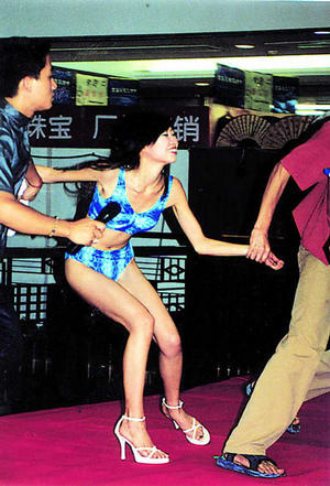 圖文:女模特脫衣推銷 男朋友憤而攪場(chǎng) 2002年08月19日 10:30 ![]() ■長(zhǎng)衫就是“防腐層”■短裙代表“塑料”■脫得只剩內(nèi)衣 ![]() ■男友硬拉模特離場(chǎng) 攝影/趙訓(xùn)成 中新網(wǎng)北京8月19日消息:讀者趙先生昨天給北京青年報(bào)打來(lái)熱線說(shuō),他前天在一個(gè)購(gòu)物廣場(chǎng)看到一個(gè)管道廠家為了讓人們更了解“管道”的內(nèi)部結(jié)構(gòu),竟然讓兩位假扮“管道”的小姐一層一層脫道具服,直到小姐的男友出面干涉才罷休。 趙先生講述了事件的整個(gè)過(guò)程:“當(dāng)時(shí),我在商場(chǎng)購(gòu)物,看見(jiàn)一家管道企業(yè)正在推介產(chǎn)品。兩位扮演‘管道’的女模特當(dāng)著眾人的面脫起衣服,這讓不少觀眾大吃一驚,還有一些母親趕緊捂上孩子的眼睛。這兩位女模特直到露出了穿在里面的內(nèi)衣才停止。忽然,一位女模特的男友出現(xiàn),硬拉女模特要離開(kāi),但廠家人員就是不讓,雙方開(kāi)始爭(zhēng)執(zhí),場(chǎng)面頓時(shí)變得異;靵y! 有關(guān)廣告專家分析說(shuō),讓消費(fèi)者反感的廣告形式有可能抬高了企業(yè)的“知名度”,但是卻降低了產(chǎn)品的“美譽(yù)度”,反而會(huì)給產(chǎn)品銷售帶來(lái)負(fù)面效果。畢竟,消費(fèi)者是否選擇這種產(chǎn)品,最終還是決定于產(chǎn)品質(zhì)量和售后服務(wù),這樣的“秀”還是少做為好。(王旭)