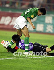 二零零二年中國甲A足球聯(lián)賽第十七輪賽事--北京國安對云南紅塔隊的比賽十八日晚在北京工人體育場舉行,國安隊憑借國腳徐云龍的一粒入球而獲勝。圖為紅塔隊“國門”區(qū)楚良飛身在對手胯下?lián)渚入U球。作者:毛建軍