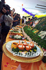 四川樂山國際大佛節(jié)旅游“美食周”九月一拉開帷幕。在為期一周的活動中,將舉行民間飲食絕活表演、展銷,“川菜十大名菜”和樂山“十佳風(fēng)味小吃”評比。圖為來樂山采訪的眾媒體記者聚焦精美菜肴。 作者:陳雯
