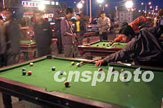 出青海西寧市沿青藏公路西行,沿途最常見的消遣方式是打臺(tái)球。在格爾木的一條夜市上,數(shù)張臺(tái)球桌都被愛好者占據(jù)。作者:王麗南