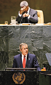 在布什講話之前﹐聯(lián)合國(guó)秘書長(zhǎng)安南在致詞時(shí)強(qiáng)調(diào)﹐在國(guó)際事務(wù)上必須尋求多邊原則﹐而且必須按照原則辦事。他還不點(diǎn)名地批評(píng)美國(guó)說﹐在國(guó)內(nèi)講法治的國(guó)家在國(guó)際事務(wù)中也應(yīng)依法辦事。他在談到國(guó)際社會(huì)面臨的四大威脅時(shí)﹐首先指出的是中東地區(qū)的巴以沖突﹐其次才是伊拉克﹐接下來是阿富汗﹐最后是南亞地區(qū)的印巴沖突。