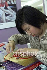 “匯豐中華慈善殘疾兒童藝術(shù)展”二十四日在北京開幕,來自培智學(xué)校的殘疾孩子在現(xiàn)場表演“中國結(jié)”的制作。作者:滿會喬